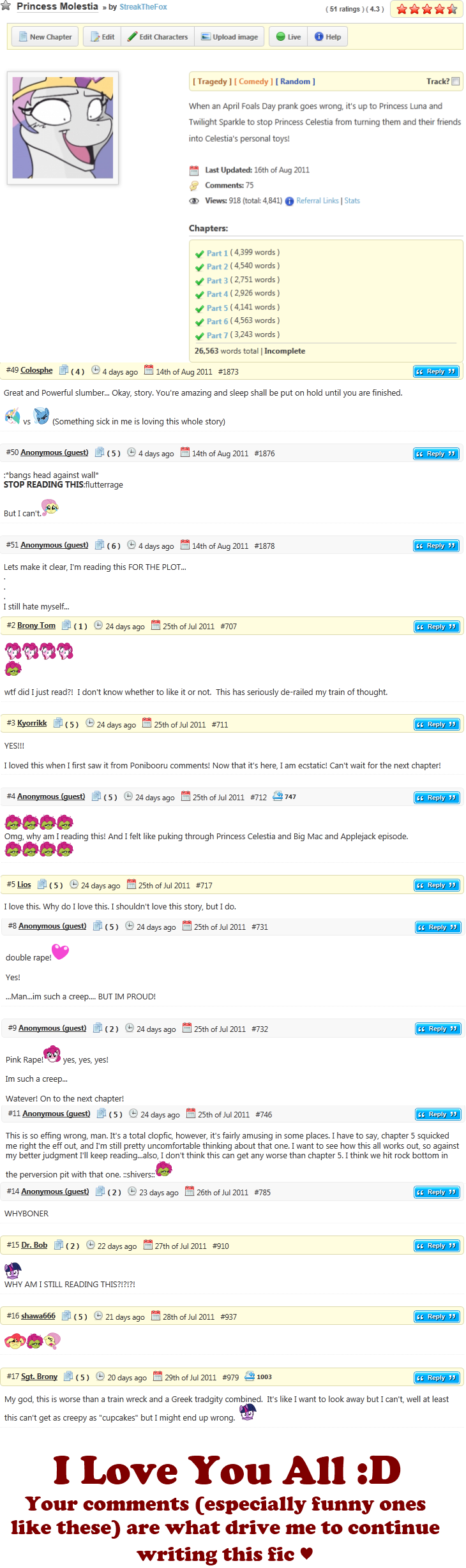 47078 - comments Molestia author:StreakTheFox celestia bronies thanks story love_you_guys fanfic.png