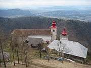 On a hill above the village is a pilgrimage centre with two churches. The main church is dedicated to Saints Primus and Felicianus and has a Romanesque design, although it was rebuilt in the 15th century and various additions were built at later stages. It has a double nave, unusual for this area, and frescos on the interior. The frescoes are particularly interesting as the scenes are set in real landscapes and much detail is given to clothes and expressions. A smaller, single nave, Gothic church, dedicated to Saint Peter, stands further up the hill. It contains a wooden painted ceiling dated to 1475 in the nave, although it is in a very poor condition, and three 17th-century gilded altars dedicated to Saint Peter, Saint Lucy, and Saint Laurence.[8]