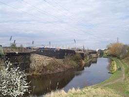 Attercliffe Station remains in 2009, seen from the Sheffield Canal, with the floodlights of the former Don Valley Stadium in the background. | |