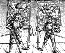 The blessed sword (Latin: ensis benedictus, Italian: stocco benedetto[1] or stocco pontificio[2]) and the blessed hat (also: ducal hat,[3] Latin: pileus or capellus,[4] Italian: berrettone pontificio[5] or berrettone ducale[6]) were a gift offered by popes to Catholic monarchs or other secular recipients in recognition of their defence of Christendom. Each pair was blessed by a pope on Christmas Eve in St. Peter's Basilica in Rome. The sword was an ornate ceremonial weapon, usually large, up to 2 metres long, with the hilt embellished with the pope's coat of arms, and the blade with the pope's name. A similarly ornate scabbard and belt were added to the sword. The hat was a cylinder made of red velvet with two lappets hanging down from its top. The right-hand side of the hat was decorated with a dove representing the Holy Spirit embroidered in pearls, while a shining sun symbolising Christ was embroidered in goldwork on the top.[7]