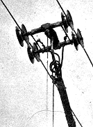 The power supply differed from those in other countries in that, as a collector, a four-wheeled truck ran underneath the wires, held in place by a trolley pole in the usual manner. The possible deviation on either side of the direct route was 10–12 feet (3.0 to 3.5 m). The cars were usually equipped with two 15-horsepower (11 kW) motors and had a carrying capacity of 20 to 24 passengers.[1] Its design and construction have been so perfected that it would take easily very sharp curves, and would not leave the trolley wires even when running at a speed of 18 miles per hour (29 km/h). They could master larger grades than trams, it was claimed.[2] The overhead wires had a diameter of ⅜ inches (9 mm) for 600 Volt direct current and could be used in both directions. The drivers stood upright in a cab similar to that of a tram.