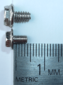 The #6-32 UNC is a UTS screw specifying a major thread diameter of #6 which is defined as 0.1380 inches (3.51 mm); and 32 tpi (threads per inch) which equates to a thread pitch of 0.031250 inches (0.7938 mm). The optional UNC specification indicates the standard coarse thread is used which is defined for #6 screws as 32 tpi rendering 'UNC' redundant, however it may be seen when other specifications such as plating or other treatments are also specified. It is by far the most common screw found inside computer cases.[1] It commonly appears in lengths of 3/16 in (0.1875 inches (4.76 mm)) and 1/4 in (0.25 inches (6.4 mm)) or less often 5/16 in (0.3125 inches (7.94 mm)). Non-standard metricized lengths such as 5 millimetres (0.20 in) are also sometimes encountered. Nearly every brand new computer case comes with a bag of these. They are commonly used for the following purposes, however there are many exceptions: