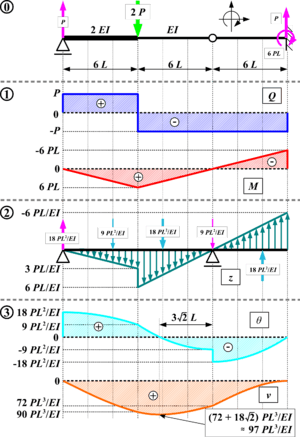 Conjugate beam is defined as the imaginary beam with the same dimensions (length) as that of the original beam but load at any point on the conjugate beam is equal to the bending moment at that point divided by EI.[1] The conjugate-beam method is an engineering method to derive the slope and displacement of a beam. The conjugate-beam method was developed by H. Müller-Breslau in 1865. Essentially, it requires the same amount of computation as the moment-area theorems to determine a beam's slope or deflection; however, this method relies only on the principles of statics, so its application will be more familiar.[2]