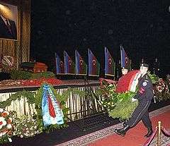 Farewell ceremony was held December 15, 2003 at the Palace of the Republic (nowadays Heydar Aliyev Palace) and was broadcast live on the main Azerbaijani TV channels. The ceremony was attended by current and former heads of states (Vladimir Putin, Nursultan Nazarbayev, Eduard Shevardnadze, Leonid Kuchma, Ahmet Necdet Sezer, Süleyman Demirel etc.). Also, a number of Heads of State expressed their condolences. Heydar Aliyev was buried in the Alley of Honor next to his wife Zarifa Aliyeva. During the funerals artillery salute was given.[4]