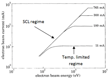 TC electron emission will occur in one of two different regimes: temperature or space charge limited current flow. For temperature limited flow every electron that obtains enough energy to escape from the cathode surface is emitted, assuming the acceleration potential of the electron gun is large enough. In this case, the emission current is regulated by the thermionic emission process, given by the Richardson Dushman equation. In SCL electron current flow there are so many electrons emitted from the cathode that not all of them are accelerated enough by the electron gun to escape the space charge. In this case, the electron gun acceleration potential limits the emission current. The below chart displays the temperature limiting currents and SCL effects. As the beam energy of the electrons is increased, the total escaping electrons can be seen to increase. The curves that become horizontal are temperature limited cases.