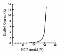 It can be seen in the below chart what a typical I-V curve looks like for a hollow cathode in electron emission mode. Given a certain keeper geometry (the ring in the figure above that the electrons exit through), ion flow rate, and Vp, the I-V profile can be determined.[52][53][54] [111-113].