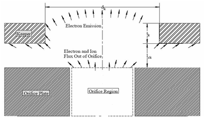 In addition, the geometry affects the emission of the plasma from the HC as seen in the below figure. Here it can be seen that, depending on the diameter and thickness of the keeper and the distance of it with respect to the orifice, the total emission percentage can be affected.[55]