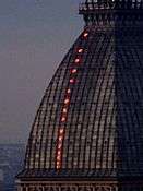 - Artist Mario Merz made the Fibonacci sequence a recurring theme in his work.[20] Examples are the Chimney of Turku Energia, in Turku, Finland, featuring the start of the Fibonacci sequence in 2m high neon lights, and the representation of the first Fibonacci numbers with red neon lights on one of the four-faced dome of the Mole Antonelliana in Turin, Italy, part of the artistic work Il volo dei Numeri ("Flight of the numbers").