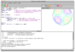 FreeFem++ is a programming language and a software focused in solving partial differential equations using the finite element method. FreeFem++ is written in C++ and developed and maintained by Université Pierre et Marie Curie and Laboratoire Jacques-Louis Lions. It runs on Linux, Solaris, OS X and MS Windows systems. FreeFem++ is free software (GPL).,[1][2]