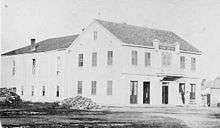 The two-story wood-frame building was called the Minnesota Haus, and was the only business in the community providing room and board to visitors.[3] Business was good, and after the hotel burned down in 1860, Gross rebuilt and renamed it as the larger Union Hotel.[7] The hotel became a focal point of activity in New Ulm and during the Dakota War of 1862, when New Ulm itself was put under siege, served as a hospital as over 185 of the city's buildings were burned.[3] Among the doctors at the hospital was William Worrall Mayo, who would later found the Mayo Clinic in Rochester, Minnesota.[7] Commercial activity increased after the conflict increased as a new influx of settlers arrived to take advantage of land provided through the Homestead Act. New Ulm began developing into a producer, exporter and processor of agricultural products and became a regional center once the railroad arrived in the area in 1872. The Union Hotel flourished, but was destroyed by fire on July 5, 1875.[3] The fire began in an adjacent large barn belonging to the hotel which spread to the main structure; the hotels furniture was saved but fire fighting efforts moved to saving other structures on the street. The loss was estimated at about $6,000; Gross was insured to $4,200.[6]