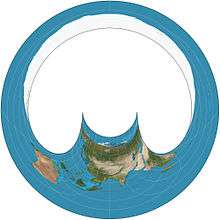 The Hammer retroazimuthal projection is a modified azimuthal proposed by Ernst Hermann Heinrich Hammer in 1910. As a retroazimuthal projection, azimuths (directions) are correct from any point to the designated center point.[1] Additionally, all distances from the center of the map are proportional to what they are on the globe. In whole-world presentation, the back and front hemispheres overlap, making the projection a non-injective function. Given a radius R for the projecting globe, the projection is defined as:
