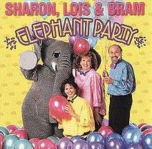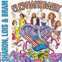 Then again in 1996, Drive Entertainment released the album in the United States under the title "Elephant Party" as well, but the cover was changed to a yellow background featuring Sharon, Lois & Bram and Elephant surrounded by balloons. It came with a pin-the-tail on the elephant game and a fold-out with lyrics to most of the songs. This edition also cut out several songs from the original recording.