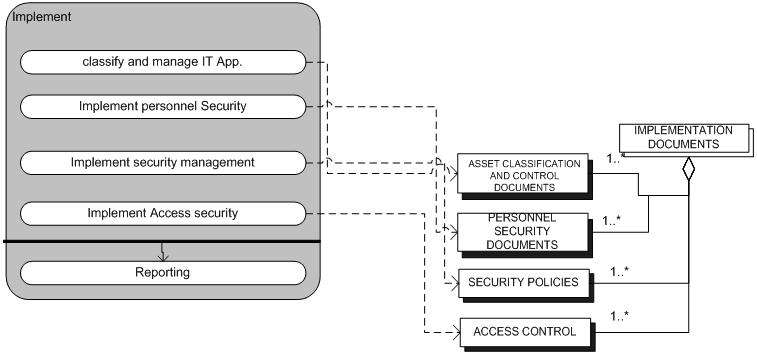 The left side of figure 2.3.1 is the meta-process model of the Implementation phase. The four labels with a black shadow mean that these activities are closed concepts and they are not expanded in this context. No arrows connect these four activities, meaning that these activities are unordered and the reporting will be carried out after the completion of all four activities.