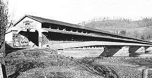 The Jay Street Bridge crosses the West Branch Susquehanna River between Lock Haven on the south bank and Lockport on the north. The original structure, completed for the Lock Haven Bridge Company by the E. Kirkbride Company in 1852, was a covered bridge about 800 feet (240 m) long.[3] A two-story toll house, 48 feet (15 m) long and 18 feet (5.5 m) wide was later added at the foot of the bridge on the Lock Haven side.[3] Travelers using the bridge passed through an archway in the center of the toll house.[3] The bridge included a covered pedestrian walkway on the downstream side.[1]