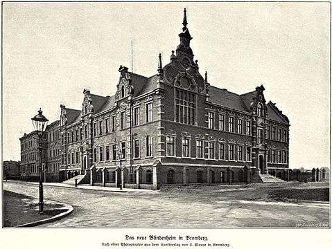 Built at the beginning of 20th century, the edifice at Roonstraße 13/14 was initially conceived as a refuge for blind children (German: Blindenheim). The initiator of the construction was the director of nearby Educational Centre for Blind Children, Anton Wittig. He organized the "Society for blind people", which, till 1901, collected funds to build a shelter in home Bydgoszcz. The hostel was operational up to 1962, as part of the specialized school.[18] Today the building houses two clinics, Śródmieście (Downtown, 445m2) and Akademicka (Academic, 312m2), and two specialist medical offices for individuals.[19]