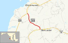 Maryland Route 344 (MD 344) is a state highway in the U.S. state of Maryland. Known as Chicamuxen Road, the state highway runs 2.16 miles (3.48 km) from MD 6 in Doncaster north to MD 224 near Chicamuxen. A connector between MD 6 and MD 224 in western Charles County, MD 344 was originally the southernmost part of MD 224. When MD 224 was rerouted to the west in the mid-1950s, MD 344 was assigned to its present course.