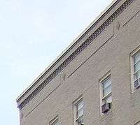 The roof's cornice line has brick corbeling. Below the c[orbeling is a row of bricks extended slightly from the facade with bricks in a diamond design intermittently interrupting the row pattern.[3]