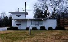 The structures were used for their intended purpose until 1953 when the gates to each of the three government sites were relocated to the specific sites.[5] The three white Gatehouses remained in federal government ownership for many years, but stood vacant.[1] In 1992, they were listed on the National Register as three separate properties, identified as the Oak Ridge Turnpike Checking Station, Bear Creek Road Checking Station, and Bethel Valley Road Checking Station.[2][3][4][6] All three were included in a larger Multiple Property Submission for Oak Ridge-related properties.[7] In 1999, the Department of Energy (DOE), the AEC-successor agency that currently controls the Bear Creek Road and Oak Ridge Turnpike properties, as well as the small structure on the Bethel Valley property, restored the large structures at the checking stations at the Oak Ridge Turnpike and Bear Creek Road sites.[8] The large structure at the Bethel Valley Road site belongs to Lockheed Martin who obtained it with the Commerce Park property in 1984 when Martin Marietta took over the managing and operating contract for the three DOE sites in Oak Ridge as well as the Portsmouth Gaseous Diffusion Plant in Portsmouth, Ohio, and the Paducah Gaseous Diffusion Plant in Paducah, Kentucky.[9] The Bethel Valley Road large structure was painted in 2005 but there has been no restoration or other attention to the interiors of the two Bethel Valley structures and the small structures at the other sites.[10]