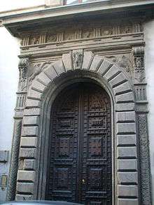 The palace was erected on land once occupied by the Camaldolese monastery of Santa Margherita delle Romite di Cafaggiolo (no longer extant).[1] It was commissioned by Simone da Firenzuola from Ammanati in 1570 and completed in 1577. Ammanati also completed the building on Alfani #32. Simone had forbidden his children from selling the palace; however, lacking male descendants, in 1640, the palace came into the Giugni family with the marriage of Niccolò Giugni and Luisa Giraldi.