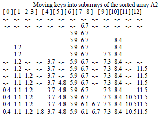 - for each key, look up its location, place it into that cell of A2; if it collides with a key already in that position, insertion sort the key into place, moving keys greater than this key to the right by one to make a space for this key. Since the subarray is big enough to hold all the keys mapped to it, such movement will never cause the keys to overflow into the following subarray.