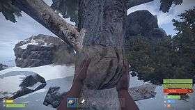 The objective in Rust is to survive in a harsh open world environment. Animals, such as wolves and bears, represent a threat to new players, but the primary danger comes from other players.[1] The player vs player combat is accomplished with bows, melee weapons and craftable guns.[2] Bullets and other projectiles travel via a ballistic trajectory. There are multiple different types of bullets for each gun.[3] Damage is calculated using hit tracking, meaning shots to the head are more damaging than shots to other parts of the body.[4] Weapon attachments, such as holosights, can be used to give players an advantage.[5] In order to survive, the player must craft tools, build bases, and team with other players. Unlike many other sandbox games, Rust only features a multiplayer mode.[1]