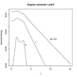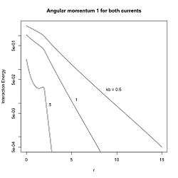 where is the angular momentum quantum number. When we recover the classical situation in which the electron orbits the magnetic field at the Larmor radius. If currents of two angular momentum and interact, and we assume the charge densities are delta functions at radius , then the interaction energy is