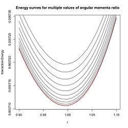 As with delta function charges, the value of in which the energy is a local minimum only depends on the total angular momentum, not on the angular momenta of the individual currents. Also, as with the delta function charges, the energy at the minimum increases as the ratio of angular momenta varies from one. Therefore, the series