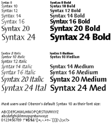 The Syntax font family was chosen by Niklaus Wirth for the Oberon operating system. During part of the period that Oberon was under development, Meier worked in Wirth's group at ETH, developing hand-optimized bitmap versions of the Syntax fonts (this was in the days prior to font anti-aliasing).