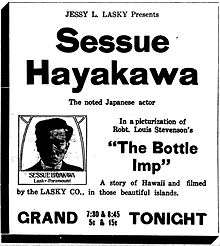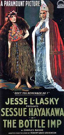 The Bottle Imp is a 1917 silent fantasy film produced by Jesse Lasky and distributed through Paramount Pictures. It is taken from the Robert Louis Stevenson short story, "The Bottle Imp". The movie was directed by Marshall Neilan in Hawaii and stars Japanese actor Sessue Hayakawa.[1]