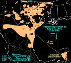 - 1 2 Gerhardt, Mary (July 10, 2010). "Tropical Depression Two Advisory Number Nine". Hydrometeorological Prediction Center. Retrieved October 24, 2010.