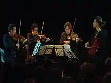 Quatuor Ébène was founded in 1999 at the Boulogne-Billancourt Conservatory in France. The group first came to international attention in 2004 when it won first prize in the string quartet category at the ARD International Music Competition, also taking the Audience Prize, two prizes for interpretation, and the Karl Klinger Foundation Prize.[1] The following year, the group won the Belmont Prize from the Forberg-Schneider Foundation.[2] In 2006, Quatuor Ébène released its first recording, a live recording of three Haydn quartets, to critical acclaim. In 2009, the quartet was named "Newcomer of the Year" by BBC Music Magazine for its recording of the Ravel, Fauré, and Debussy string quartets.[3] The same album won the group Recording of the Year at the 2009 Classic FM Gramophone Awards.[4] In 2010, the group was named Ensemble of the Year at the Victoires de la Musique Classique.[5] NPR named Ébène's "Fiction" album one of its 50 favorite albums of 2011, describing the quartet's performance as brimming with "silky smoothness and Gallic finesse."[6]