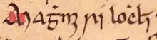 ![]() Óláfr's name and title as it appears on folio 35v. of British Library Cotton Julius A VII (the Chronicle of Mann): "Olavus rex".[1] | |