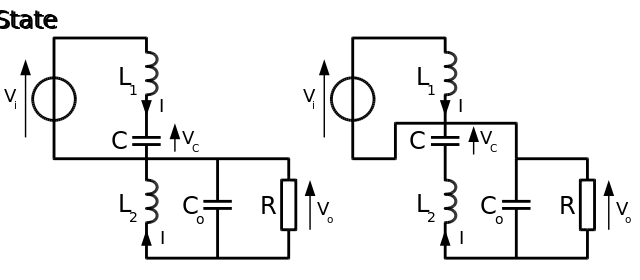 - in the on-state, inductor L1 is directly connected to the input source. Therefore . Inductor L2 is connected in series with C and the output capacitor, so