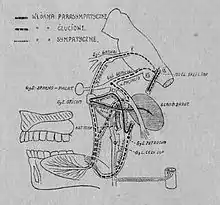 Frey's publication about auriculotemporal nerve syndrome, now widely known as "Frey's syndrome" ("zespół Łucji Frey" in Polish), was published in 1923, first in Polish journal "Polska Gazeta Lekarska", and later that year in renowned French journal "Revue Neurologique".[15] It was not the very first description of this constellation of symptoms.[16][17] Frey's predecessors were Kastremsky (1740), Duphenix (1757),[18] Barthez (1806),[19] Dupuy (1816),[20] Brown-Sequard (1849),[21][22] Baillarger (1853), Henle (1855),[23] Berard (1855),[24] Bergounhioux (1859),[25] Rouyer (1859),[26] Botkin (1875),[27] Parkes Weber (1897),[28] New and Bozer (1922)[29] and Lipsztat (1922).[30] Both Brown-Sequard and Henle reported their own symptoms.[17] All these observations lack a wide view of the anatomy, pathology and exact mechanism of gustatory sweating. Łucja Frey's article "Przypadek zespołu nerwu usznoskroniowego" ("Le Syndrome du Nerf Auriculo-Temporal") is considered to be the first such description of the phenomenon. Frey was first to recognize this syndrome as a disorder of both sympathetic and parasympathetic innervations.[4]