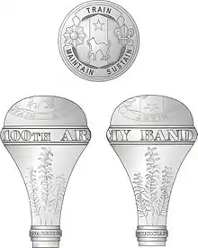 ![]() 100th Army Band Drum Major's baldric | ![]() 100th Army Band Drum Major's mace ![]() 100th Army Band herald trumpet's tabard | ![]() 100th Army Band snare drum design ![]() 100th Army Band unit tab | |