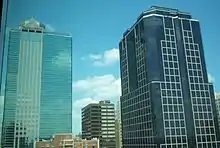 The 1201 Walnut Building is a Skyscraper located in Downtown Kansas City, Missouri, USA, built by HNTB Architects in 1991.[3] Found at the intersection of 12th and Walnut streets, it is the eighth tallest habitable structure in the Kansas City Metropolitan Area, and the twelfth-tallest habitable structure in Missouri, at 427 feet. The exterior is made of mostly dark-colored glass, and granite panels, and is very close the new Sprint Center and Power & Light District, part of the redevelopment of downtown Kansas City. The glass look helps to further the glass-theme that the Sprint Center, H&R Block Building, and the Kansas City Star printing press have. In late 2010, building tenant Stinson Leonard Street, LLP acquired the rights to place a large sign and corporate logo atop the southern face of the building.
