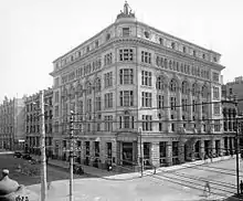 The site at the corner of St Georges Terrace and William Street known as "Carr's Corner"[3] was purchased by AMP in 1910,[1] and in 1915 the AMP Chambers designed by Oldham and Cox were built on the corner.[5] This six-storey building was clad with sandstone, and the interior was decorated with jarrah.[6]