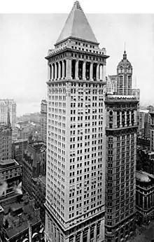 The original structure is a 39-story tower without any setbacks, composed of 32 stories topped by a seven-story roof.[22] The concept behind the original structure's design was to place a pyramidal roof, similar to that of the Mausoleum of Halicarnassus on top of a tower like Venice's St Mark's Campanile bell tower.[12] Trowbridge wanted to "enhanc[e] the beauty of the upper part of building by a loggia and a stone pyramid, in place of the usual flat or mansard roof."[12][23] This was one of the first times a pyramidal roof had been used in a skyscraper (after only the Metropolitan Life Insurance Company Tower);[24] previous tall structures had been capped by a cupola, spire, or tempietto.[25]