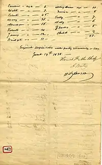 In 1838, 272 men, women, and children were sold by the Maryland Jesuits; a portion of the proceeds was used to pay the debts of Georgetown College (now Georgetown University), also run by the Jesuits. The slaves had lived on plantations belonging to the Jesuits in Maryland, and they were sold to Henry Johnson and Jesse Batey. The sale price was $115,000, equivalent to $2,761,078 in 2019.[1] Of the $25,000 down-payment, $17,000 was used to pay down building debt that Thomas F. Mulledy, the provincial superior who orchestrated the sale, had accrued as president of Georgetown College.[2][3][4]