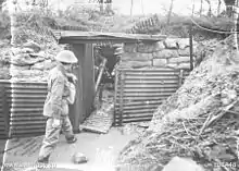 After returning to Egypt, the AIF underwent a period of reorganisation as it was expanded from two infantry battalions to five prior to their transfer to Europe.[9] As the battalion was rebuilt, further training was undertaken before it was sent to France, arriving there in late March 1916. For the next two-and-a-half years they participated in most of the main battles fought by the Australians on the Western Front. Their first major action came at Pozières in mid-1916 as part of the wider Battle of the Somme, being committed twice in July and August. In late August, the 18th was withdrawn to Belgium to recover, before returning to the Somme in October. For the rest of 1916, the battalion undertook defensive duties along the front, although they were not involved in any major attacks. The following year, the Germans shortened their lines and withdrew to the Hindenburg Line, after which the 18th Battalion took part in the fighting around Warlencourt in February 1917 as the Allies sought to follow up the German withdrawal. A brief advance followed before they came up against the forward positions of the Hindenburg Line. In May, the 18th Battalion was committed to the Second Battle of Bullecourt before moving again to Belgium where they saw further action around the Ypres Salient at Menin Road in September and Poelcappelle in October before settling down for the winter.[3]