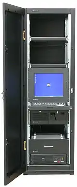 A 19-inch rack is a standardized frame or enclosure for mounting multiple electronic equipment modules. Each module has a front panel that is 19 inches (482.6 mm) wide. The 19 inch dimension includes the edges or "ears" that protrude from each side of the equipment, allowing the module to be fastened to the rack frame with screws. Common uses include computer servers, telecommunications equipment and networking hardware, audiovisual production gear, and scientific equipment.