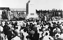 The cremations began on Saturday, September 7; 38 bodies were burned together at the collection point beside Snake Creek. Over the next week 136 bodies were cremated on Upper Matecumbe Key at 12 different locations. On Lower Matecumbe Key 82 were burned at 20 sites. On numerous small keys in Florida Bay bodies were either burned or buried where found. This effort continued into November. 123 bodies had been transported to Miami before the embargo. These were processed at a temporary morgue staffed by fingerprint experts and 8 volunteer undertakers under tents at Woodlawn Park Cemetery (3260 SW 8th St, Miami). The intention was to identify the remains and prepare them for burial or further shipment. With the embargo in force, immediate burial of all the bodies at Woodlawn was mandatory. FERA purchased a plot in Section 2A. The VA coordinated the ceremony with full military honors on September 8.[54] 109 bodies were buried in the FERA plot: 81 veterans, 9 civilians and 19 unidentified bodies.[55] Some records claim 259 veterans were victims of the Hurricane: