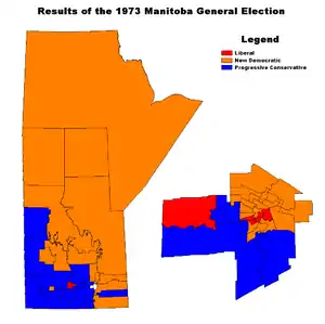The 1973 Manitoba general election was held on June 28, 1973 to elect Members of the Legislative Assembly of the Province of Manitoba, Canada. It was won by the social-democratic New Democratic Party, which took 31 of 57 seats to win government in its own right for the first time. The Progressive Conservative Party finished second with 21, while the Manitoba Liberal Party took the remaining five.