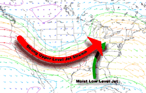 While violent tornado activity increased over the warm sector, a third band of convection developed at about 16 UTC and extended from near St. Louis into west-central Illinois. Based upon real-time satellite imagery and model data, differential positive vorticity advection coincided with the left exit region of an upper-level jet streak that reached wind speeds of up to 130 kn (150 mph) (66.9 m/s (241 km/h)), thereby enhancing thunderstorm growth.[7] Storms grew rapidly in height and extent, producing baseball-sized hail by 1720 UTC in Illinois and, shortly thereafter, in St. Louis, Missouri, which reported a very severe thunderstorm early in the afternoon that, while not producing a tornado, was the costliest storm to hit the city up to that time.[8] By 1950 UTC, supercells producing F3 tornadoes hit the Decatur and Normal areas in Illinois. As thunderstorms moved into the warmer, moister air mass over eastern Illinois and Indiana, they produced longer-lived tornadoes—one of which began near Otterbein and ended near Angola in Indiana, a distance of 109 mi (180 km).[6][7] Meanwhile, by 00 UTC the southern half of the first convective band became indistinguishable from new convection that had formed farther south over Alabama and Tennessee in connection with convective band two. In this area, increasing west-southwesterly wind shear at all levels of the troposphere, juxtaposed over near-parallel outflow boundaries, allowed successive supercells, all producing strong, long-tracked tornadoes, to develop unconstrained by their outflow in a broad region from south Tennessee into eastern Mississippi.[8] These storms, forming after 23 UTC, produced some of the most powerful tornadoes of the outbreak, including two F5s near Tanner and an extremely potent F5 that devastated Guin in Alabama.[7]