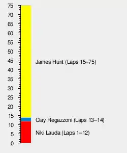 The race was delayed by rainstorms as the teams persuaded the organizers to let them run on wet tyres. Lauda led from Jody Scheckter whilst Vittorio Brambilla and Patrick Depailler collided. Jochen Mass was having metering unit troubles and Jacky Ickx exploded his engine. Meanwhile, Hunt had changed onto dry tyres and was gaining time rapidly on the drying surface to take the lead from Jarier and Lauda by lap 15. The Austrian championship leader was finding overtaking a very difficult prospect indeed. Emerson Fittipaldi dropped out with engine problems whilst John Watson broke a wing support and Carlos Reutemann got past Tom Pryce who was suffering from brake problems.