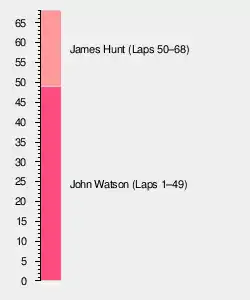 James Hunt had started from pole position with John Watson along side him. But typically, Hunt did not get a good start due to clutch problems at the start and dropped back to 4th as a result. This allowed Watson to take the lead into the first corner ahead of Niki Lauda's Ferrari and Jody Scheckter's Wolf. However, as the race had slowly progressed Hunt eventually managed to re-overtake Lauda and Scheckter and re-passed Watson for the race lead as the British drivers were running first and second. But the order of the top 2 did not stay the same as Watson started to slow when his fuel system failed on lap 53 and retired only 8 laps later. With Watson dropping out of contention this promoted Niki Lauda to second and Jody Scheckter to third. But Scheckter was also forced to retire later on when his engine failed on lap 60 which gave Mario Andretti in the leading Lotus third before his engine had also failed 3 laps later but was classified 14th. As Gunnar Nilsson in the remaining Lotus was given 3rd place and stayed there. James Hunt had finally managed to take his first win of the season for McLaren to the delight of the British fans, ahead of championship leader Niki Lauda, Gunnar Nilsson, Jochen Mass in the second McLaren, Hans Joachim Stuck in the remaining Brabham and Jacques Laffite in the only Ligier.