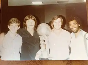 Maccabee Los Angeles players hold Dewar Cup. L to R: Carlos Roveri, Leo Kulinczenko, Peter Gonzales, Russell Hulse
