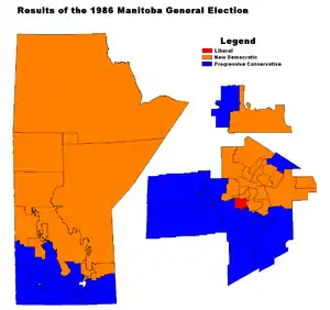 The 1986 Manitoba general election was held on March 18, 1986 to elect Members of the Legislative Assembly of the Province of Manitoba, Canada. It was won by the New Democratic Party, which took 30 seats out of 57. The Progressive Conservative Party won 26 seats and formed the official opposition. The Manitoba Liberal Party, which had not been represented in the previous legislature, won one seat.