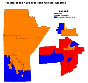 The 1988 Manitoba general election was held on April 26, 1988[1] to elect Members of the Legislative Assembly of the Province of Manitoba, Canada. It resulted in a minority government. The Progressive Conservative Party won 25 seats, against 20 for the Liberal Party and 12 for the New Democratic Party.