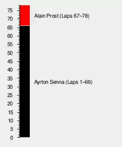 On lap 54, Prost passed Berger for second on the run to Sainte-Dévote, though he was some 50 seconds behind Senna. In an effort to put some pressure on his team-mate, he started trading fastest laps with him. With 11 laps remaining, McLaren team boss Ron Dennis radioed Senna to slow down to ensure a safe 1-2 finish, allowing Prost to gain six seconds.[2]